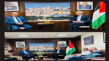 • أمين سر حركة فتح اقليم رام الله والبيرة الحاج موفق سحويل وأعضاء لجنة الاقليم، خلال زيارتهم وتهنئتهم لرئيس الهيئة الوزير رائد أبو الحمص >