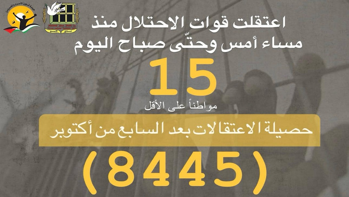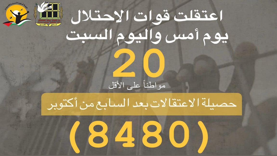 يشار إلى أنّ حصيلة الاعتقالات بعد السابع من أكتوبر، بلغت نحو (8495)، وهذه الحصيلة تشمل من جرى اعتقالهم من المنازل، وعبر الحواجز العسكرية، ومن اضطروا لتسليم أنفسهم تحت الضغط، ومن احتجزوا كرهائن.