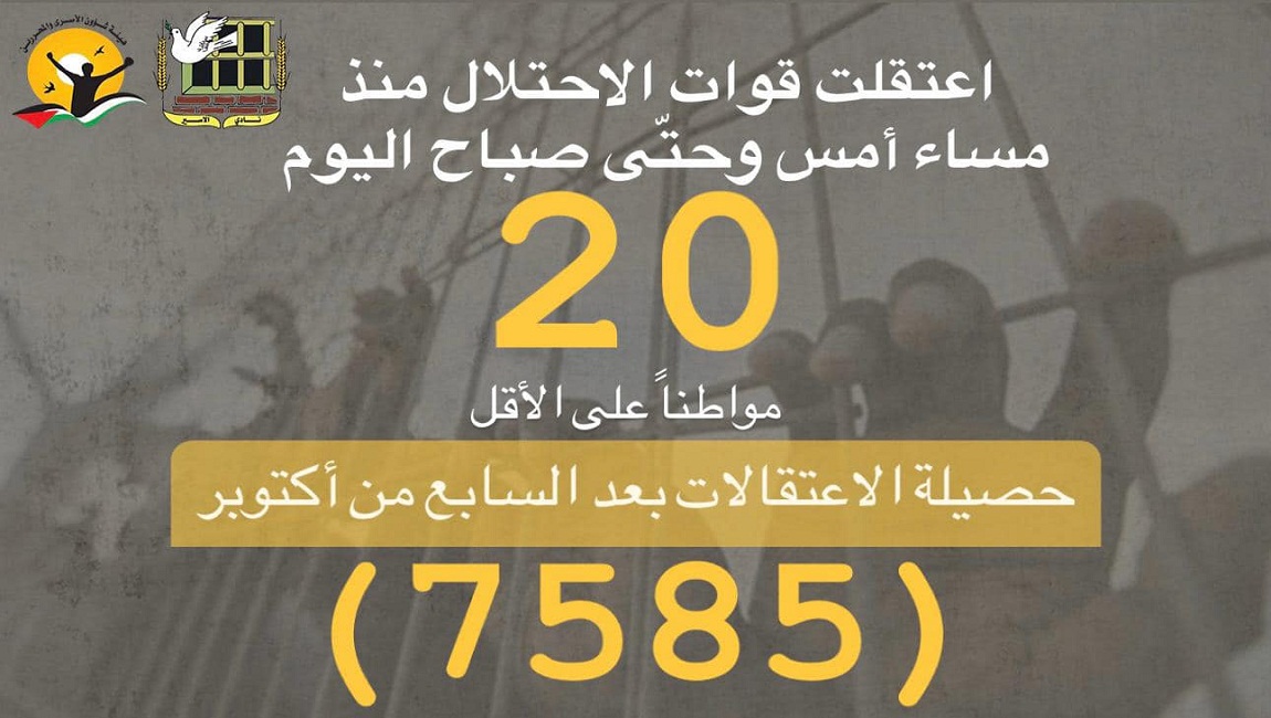 يشار إلى أنّ حصيلة الاعتقالات بعد السابع من أكتوبر، بلغت أكثر من (7630)، وهذه الحصيلة تشمل من جرى اعتقالهم من المنازل، وعبر الحواجز العسكرية، ومن اضطروا لتسليم أنفسهم تحت الضغط، ومن احتجزوا كرهائن.