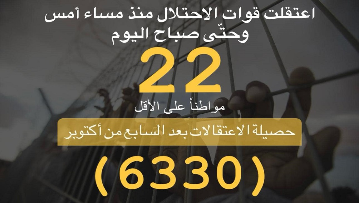 وبذلك ترتفع حصيلة الاعتقالات بعد السابع من أكتوبر، إلى نحو (6330)، وهذه الحصيلة تشمل من جرى اعتقالهم من المنازل، وعبر الحواجز العسكرية، ومن اضطروا لتسليم أنفسهم تحت الضغط، ومن احتجزوا كرهائن.