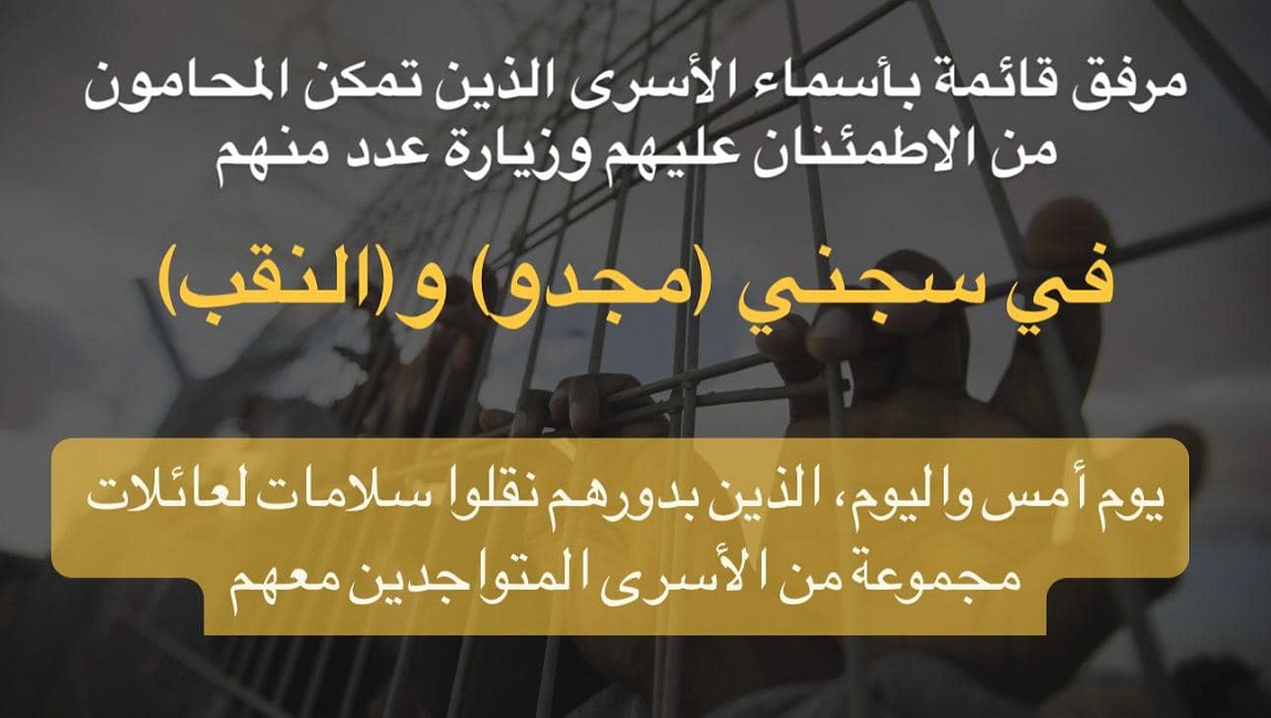 📌 *مرفق قائمة بأسماء الأسرى الذين تمكن المحامون من الاطمئنان عليهم وزيارة عدد منهم في سجني (مجدو) و(النقب) يوم أمس واليوم، الذين بدورهم نقلوا سلامات لعائلات مجموعة من الأسرى المتواجدين معهم*