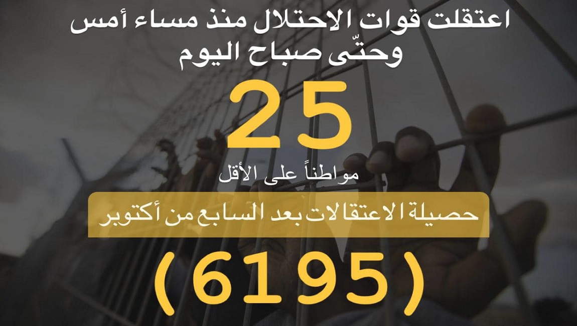 وبذلك ترتفع حصيلة الاعتقالات بعد السابع من أكتوبر إلى نحو (6195)، وهذه الحصيلة تشمل من جرى اعتقالهم من المنازل، وعبر الحواجز العسكرية، ومن اضطروا لتسليم أنفسهم تحت الضغط، ومن احتجزوا كرهائن.