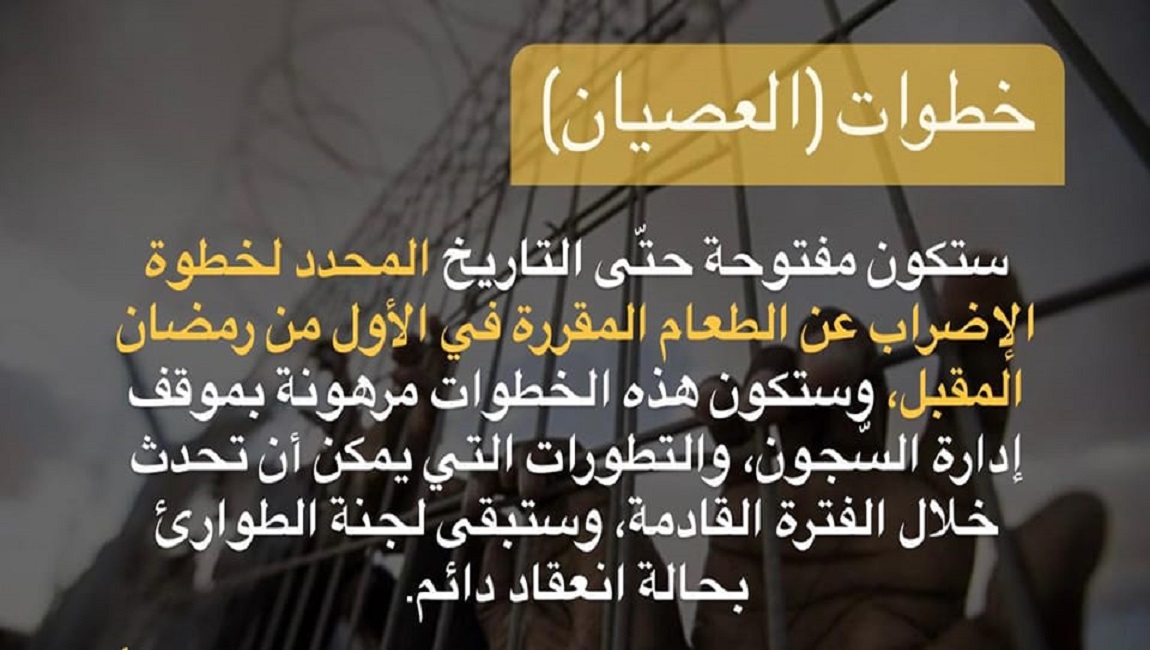 *خطوات (العصيان) ستكون مفتوحة حتّى التاريخ المحدد لخطوة الإضراب عن الطعام المقررة في الأول من رمضان المقبل، وستكون هذه الخطوات مرهونة بموقف إدارة السّجون، والتطورات التي يمكن أن تحدث خلال الفترة القادمة، وستبقى لجنة الطوارئ بحالة انعقاد دائم.*