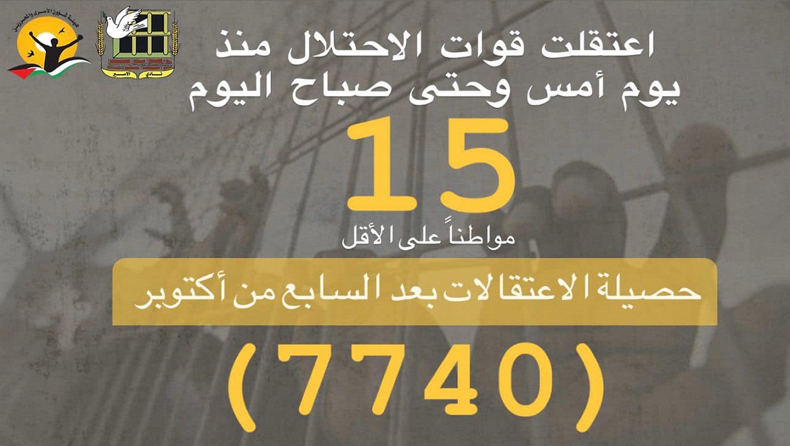 يشار إلى أنّ حصيلة الاعتقالات بعد السابع من أكتوبر، بلغت أكثر من (7725)، وهذه الحصيلة تشمل من جرى اعتقالهم من المنازل، وعبر الحواجز العسكرية، ومن اضطروا لتسليم أنفسهم تحت الضغط، ومن احتجزوا كرهائن.