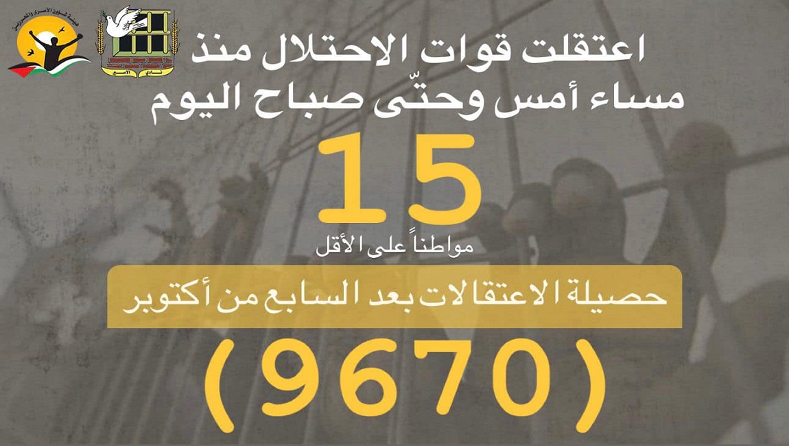 يُشار إلى أن حصيلة الاعتقالات بعد السابع من أكتوبر، بلغت أكثر من (9670)، وهذه الحصيلة تشمل من جرى اعتقالهم من المنازل، وعبر الحواجز العسكرية، ومن اضطروا لتسليم أنفسهم تحت الضغط، ومن احتجزوا كرهائن.