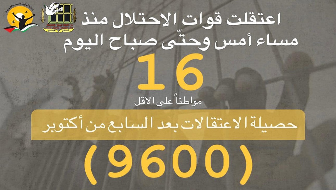 يُشار إلى أنّ حصيلة الاعتقالات بعد السابع من أكتوبر، بلغت نحو (9600)، وهذه الحصيلة تشمل من جرى اعتقالهم من المنازل، وعبر الحواجز العسكرية، ومن اضطروا لتسليم أنفسهم تحت الضغط، ومن احتجزوا كرهائن.