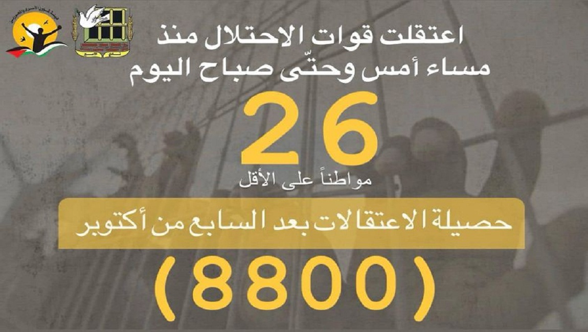 يشار إلى أنّ حصيلة الاعتقالات بعد السابع من أكتوبر، بلغت نحو (8800)، وهذه الحصيلة تشمل من جرى اعتقالهم من المنازل، وعبر الحواجز العسكرية، ومن اضطروا لتسليم أنفسهم تحت الضغط، ومن احتجزوا كرهائن.