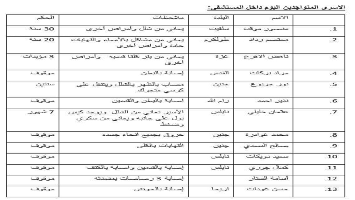و يتواجد حاليا في مستشفى سجن الرملة 13 أسيرا، يعانون من أمراض مزمنة وأوضاع صحية صعبة، وبحاجة الى رعاية دائمة