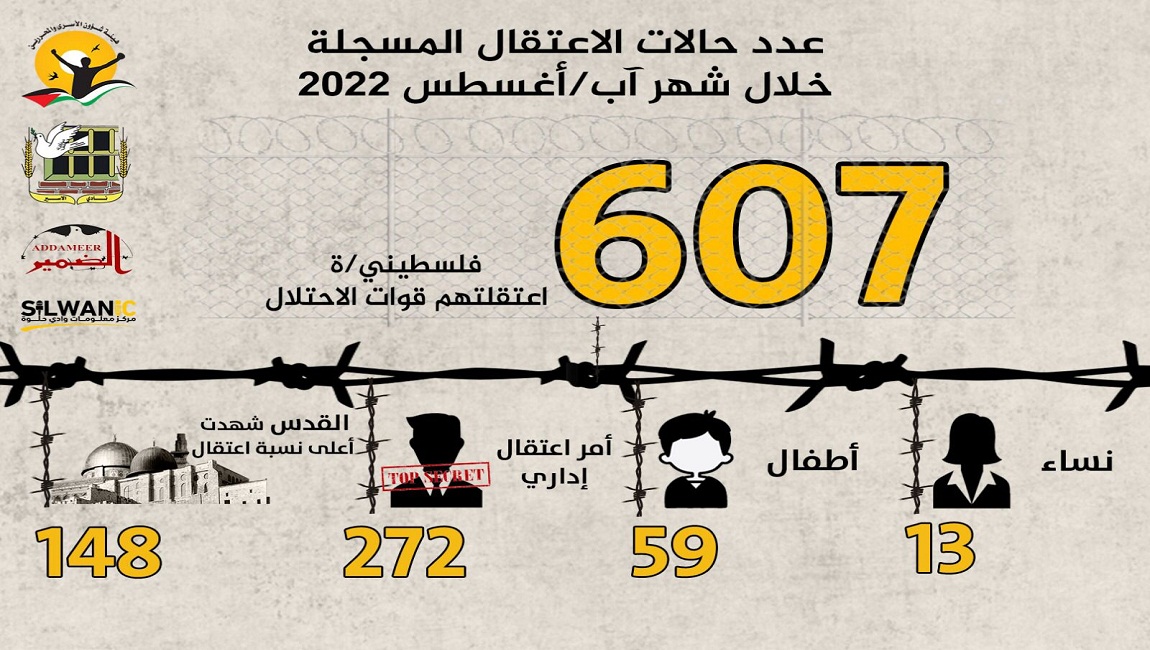 اعتقلت سلطات الاحتلال الإسرائيلي خلال شهر آب/ أغسطس 2022، (607) فلسطينيًا/ة من الأرض الفلسطينية المحتلّة، من بينهم (59) طفلاً، و(13) من النساء، وشكلت حالات الاعتقال في القدس النسبة الأعلى كما في كل شهر ، تليها الخليل، وبيت لحم، وجنين.