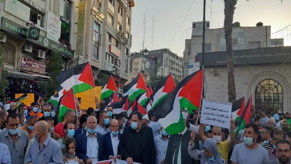 رام الله: جماهير غفيرة من أبناء شعبنا تتظاهر رفضا للتطبيع مع الاحتلال