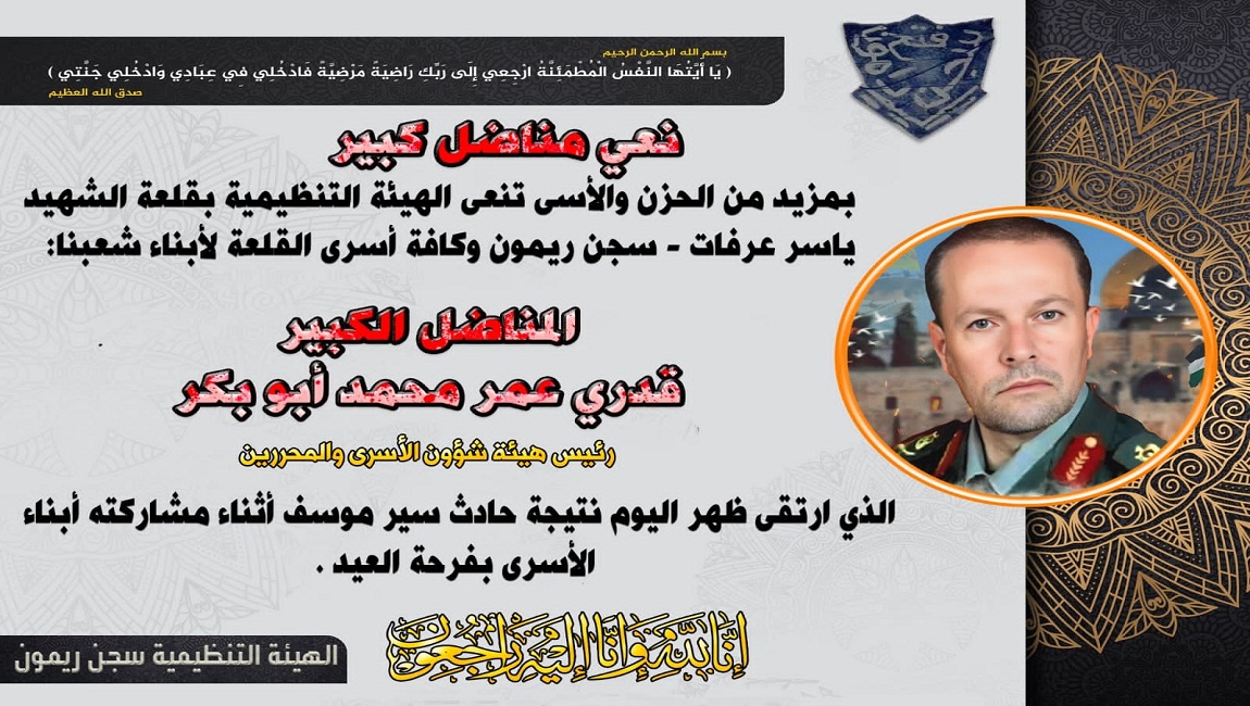 بقلوبٍ مؤمنةٍ بقدر الله، وبأسمى آيات الحزن والمواساة، تنعى لجنة الطوارئ الوطنية العليا للحركة الوطنية الأسيرة في سجون الاحتلال الاسرائيلي رفيق القيد والمسيرة القائد الوطني الكبير والأسير المحرر، الأخ اللواء قدري أبو بكر "أبو فادي"، رئيس هيئة شؤون الأسرى والمحررين وعضو المجلس الثوري لحركة فتح، الذي قضى في حادث سير مؤسف وهو في خضم انشغاله الدائم بمتابعة قضايا الأسرى وهموم ذويهم، سائلين المولى -عز وجل- أن يتغمده بواسع رحمته، وأن يسكنه فسيح جناته مع الشهداء والصديقين، وأن يلهم ذويه جميل الصبر والسلوان وحسن العزاء.