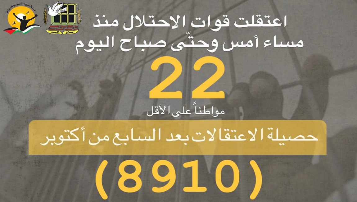 يُشار إلى أنّ حصيلة الاعتقالات بعد السابع من أكتوبر، بلغت أكثر من (8910)، وهذه الحصيلة تشمل من جرى اعتقالهم من المنازل، وعبر الحواجز العسكرية، ومن اضطروا لتسليم أنفسهم تحت الضغط، ومن احتجزوا كرهائن.