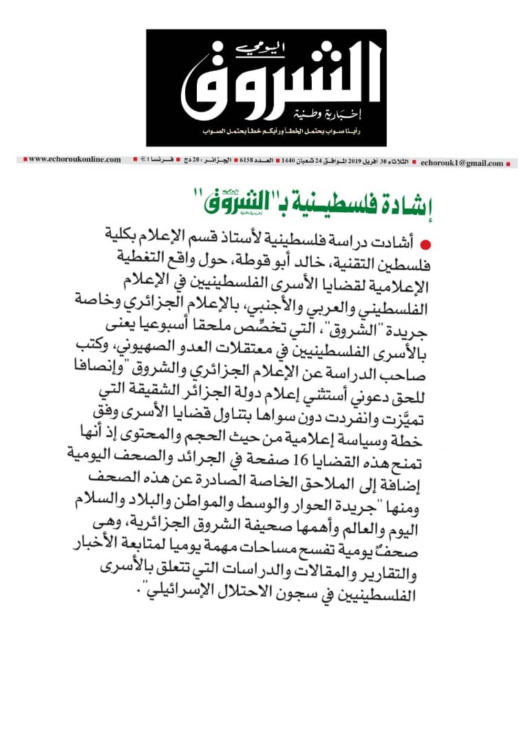 في 02 أيار 2019. نشر في الاسرى في الاعلام الجزائري