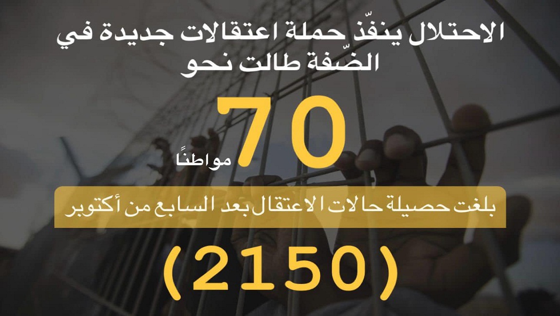 طباعة *الاحتلال ينفّذ حملة اعتقالات جديدة في الضّفة طالت نحو (70) مواطنًا* 📌 *بلغت حصيلة حالات الاعتقال بعد السابع من أكتوبر (2150)* في 06 تشرين2/نوفمبر 2023. نشر في الاخبار العاجلة