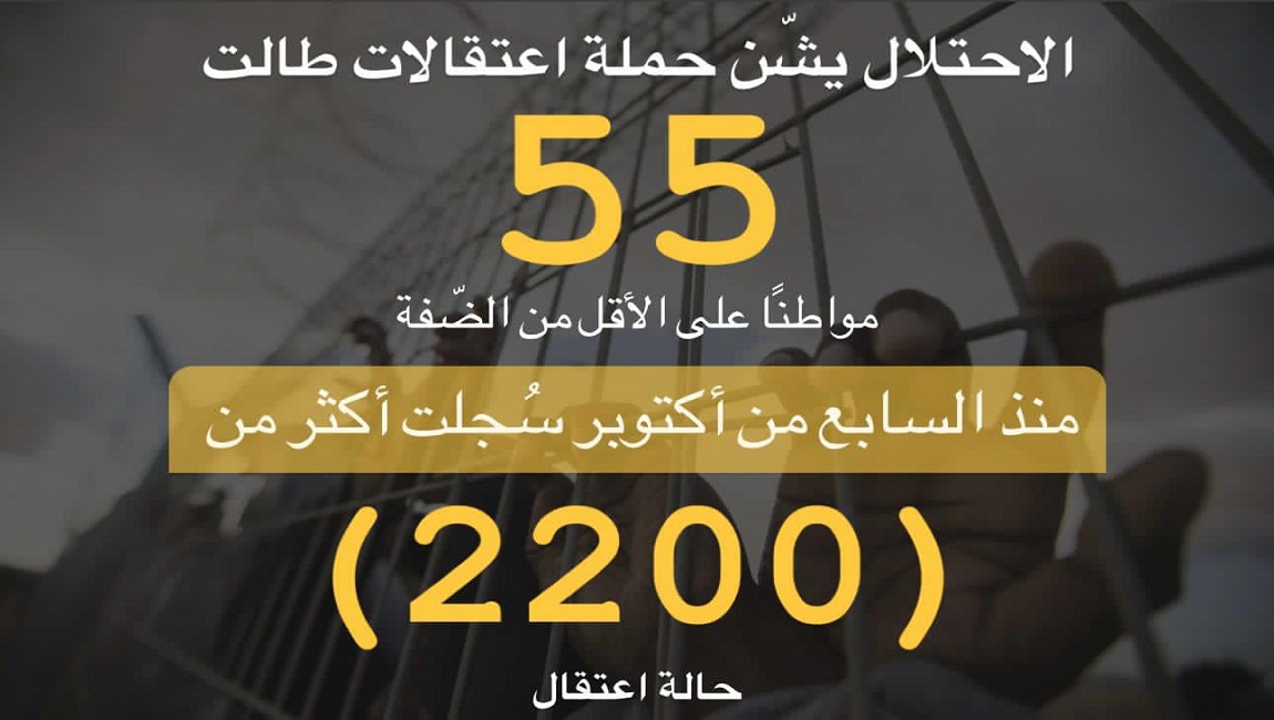 طباعة *صادر عن هيئة الأسرى ونادي الأسير* 📌 *الاحتلال يشّن حملة اعتقالات طالت 55 مواطنًا على الأقل من الضّفة* في 07 تشرين2/نوفمبر 2023. نشر في الاخبار العاجلة