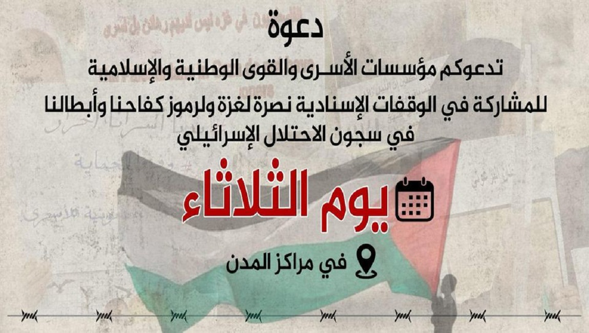 طباعة تدعوكم مؤسسات الأسـرى والقوى الوطنية والإسلامية، للمشاركة في الوقفات الإسنادية نصرة لغزة ولرموز كفاحنا وأبطالنا في سجون الاحتلال الإسرائيلي في 11 تشرين2/نوفمبر 2023. نشر في الاخبار العاجلة