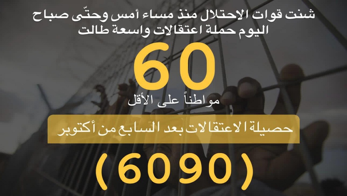 طباعة شنت قوات الاحتلال منذ مساء أمس وحتّى صباح اليوم الخميس حملة اعتقالات واسعة طالت (60) مواطنًا على الأقل من الضفة، بينهم والدة الشهيد عدي أبو جحيشة من الخليل، وأسرى سابقون. في 18 كانون2/يناير 2024. نشر في الاخبار العاجلة