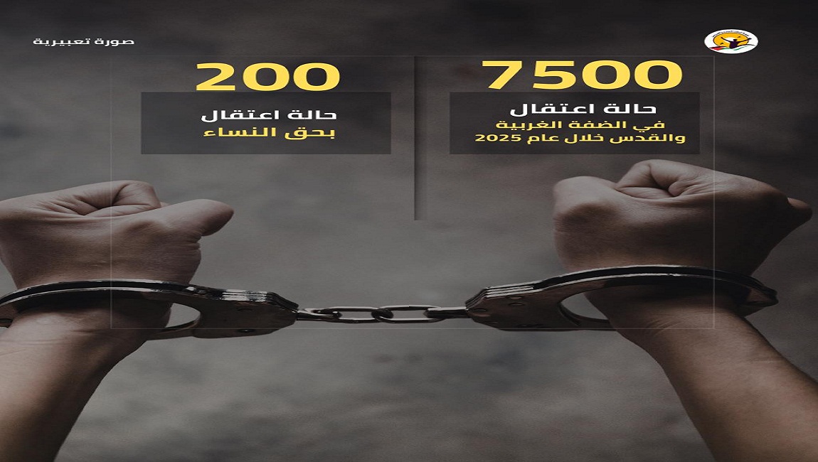 طباعة استمرّت حملات اعتقال ممنهجة في الضفة الغربية والقدس طوال عام 2025، حيث تم توثيق 7,500 حالة اعتقال شملت رجالاً، نساءً، وأطفالاً. في 14 كانون2/يناير 2026. نشر في الاخبار