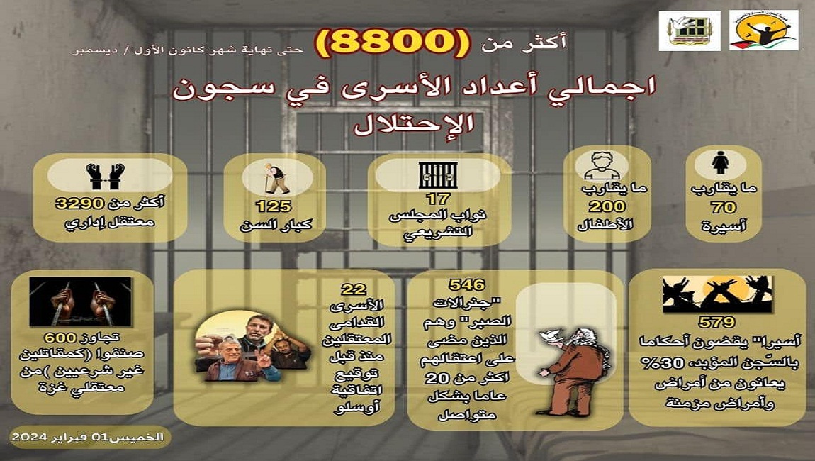 طباعة اكثر من (8800) حتى نهاية شهر كانون الاول ديسمبر اجمالي اعداد الاسرى في سجون الاحتلال في 01 شباط/فبراير 2024. نشر في تقارير احصائية