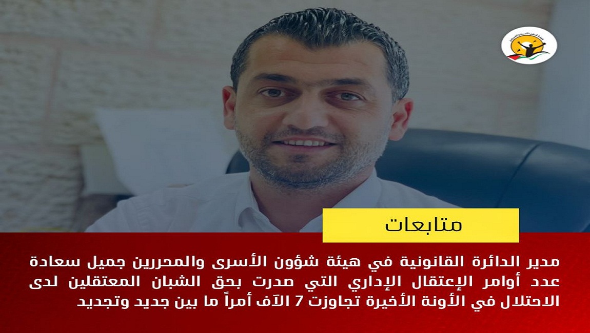 طباعة عدد أوامر الإعتقال الإداري التي صدرت بحق الشبان المعتقلين لدى الاحتلال في الأونة الأخيرة تجاوزت 7 الآف أمراً ما بين جديد وتجديد . في 17 تموز/يوليو 2025. نشر في الاخبار العاجلة