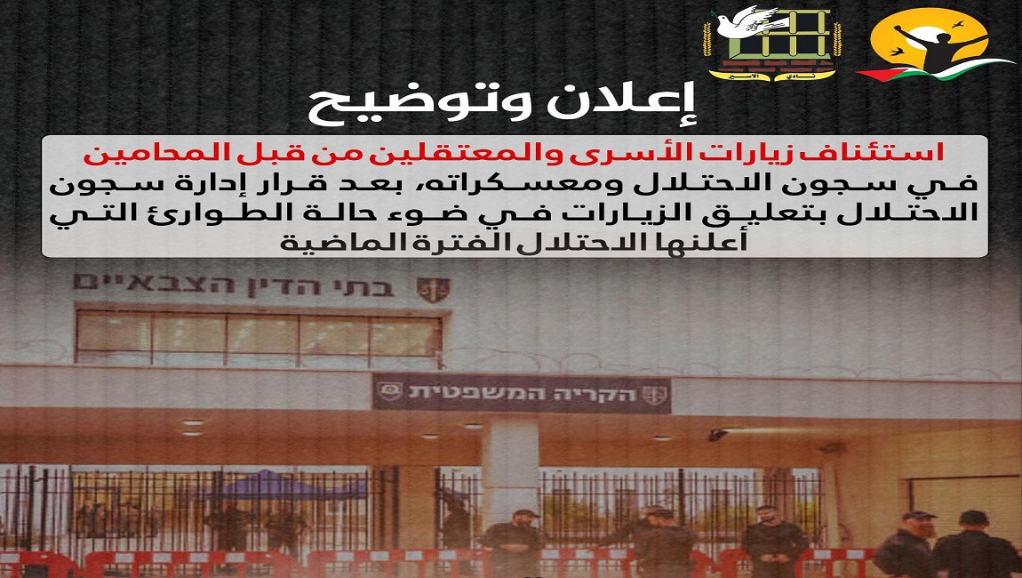 طباعة تنويه: استئناف زيارات الأسرى والمعتقلين فقط من قبل المحامين، حيث يواصل الاحتلال منع زيارات العائلات منذ تاريخ السابع من أكتوبر 2023. في 29 حزيران/يونيو 2025. نشر في الاخبار العاجلة