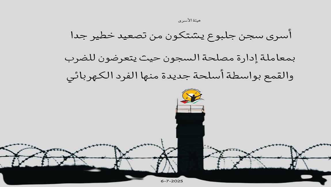طباعة أسرى سجن جلبوع يشتكون من تصعيد خطير جدا بمعاملة إدارة مصلحة السجون حيث يتعرضون للضرب و القمع بواسطة أسلحة جديدة منها الفرد الكهربائي في 06 تموز/يوليو 2025. نشر في الاخبار العاجلة