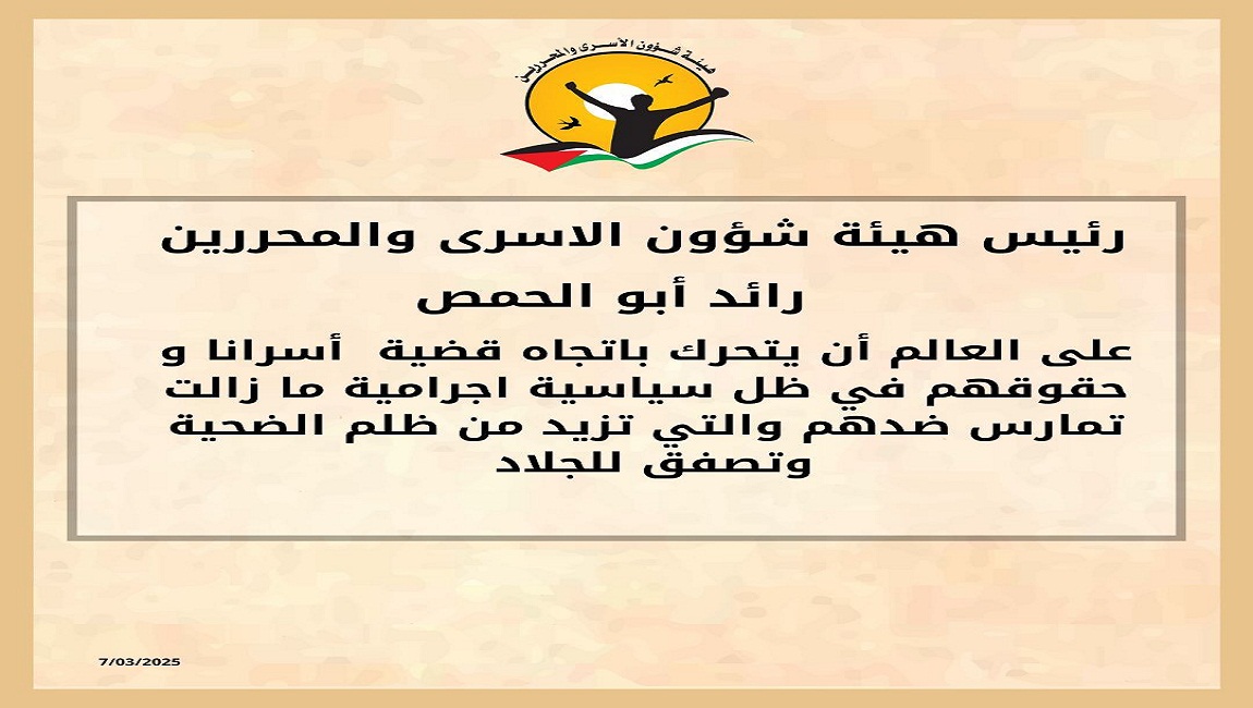 طباعة رئيس هيئة شؤون الاسرى والمحررين رائد أبو الحمص : على العالم أن يتحرك باتجاه قضية أسرانا و حقوقهم في ظل سياسية اجرامية ما زالت تمارس ضدهم والتي تزيد من ظلم الضحية وتصفق للجلاد . في 07 آذار/مارس 2025. نشر في الاخبار العاجلة
