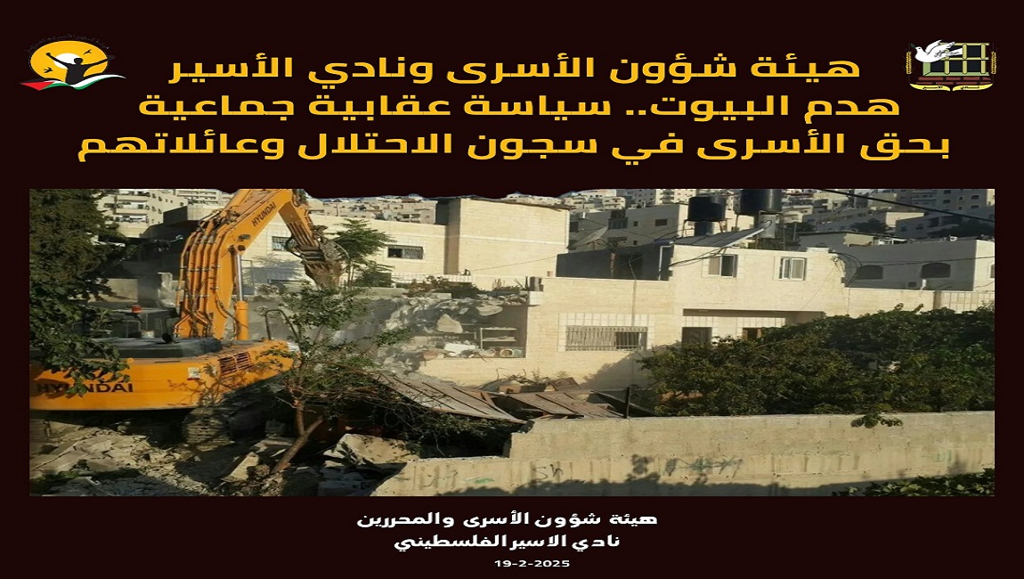 طباعة هيئة شؤون الأسرى ونادي الأسير: هدم البيوت.. سياسة عقابية جماعية بحق الأسرى في سجون الاحتلال وعائلاتهم في 19 شباط/فبراير 2025. نشر في الاخبار العاجلة
