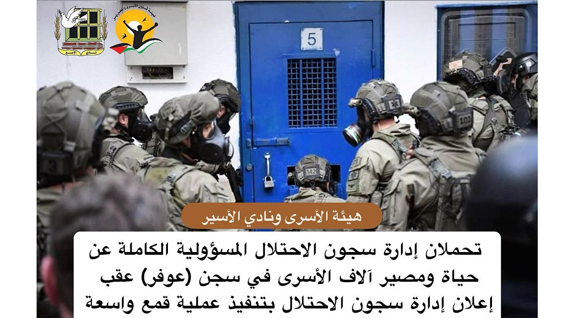 طباعة هيئة الأسرى ونادي الأسير تحملان إدارة سجون الاحتلال المسؤولية الكاملة عن حياة ومصير آلاف الأسرى في سجن (عوفر) عقب إعلان إدارة سجون الاحتلال بتنفيذ عملية قمع واسعة* في 16 شباط/فبراير 2025. نشر في الاخبار العاجلة