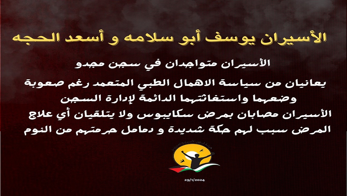 طباعة الأسيران يوسف أبو سلامة و أسعد الحجة يعانيان نتيجة الإهمال الطبي المتعمد بحقهم في سجن مجدو في 29 كانون2/يناير 2025. نشر في الاخبار العاجلة