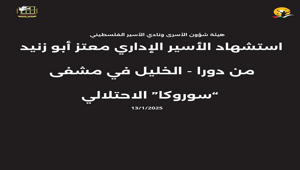 طباعة هيئة شؤون الأسرى ونادي الأسير الفلسطيني إدارة سجون الاحتلال نقلت جثمان الأسير الشهيد معتز أبو زنيد لمعهد الطب العدلي في أبو كبير في 13 كانون2/يناير 2025. نشر في الاخبار العاجلة
