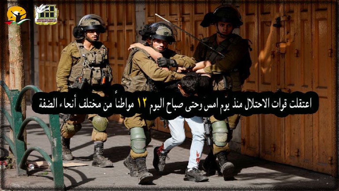 طباعة اعتقلت قوات الاحتلال الإسرائيلي منذ مساء أمس وحتّى صباح اليوم الثلاثاء (12) مواطناً على الأقل من الضّفة، بينهم أطفال، وأسرى سابقون. في 19 تشرين2/نوفمبر 2024. نشر في الاخبار العاجلة
