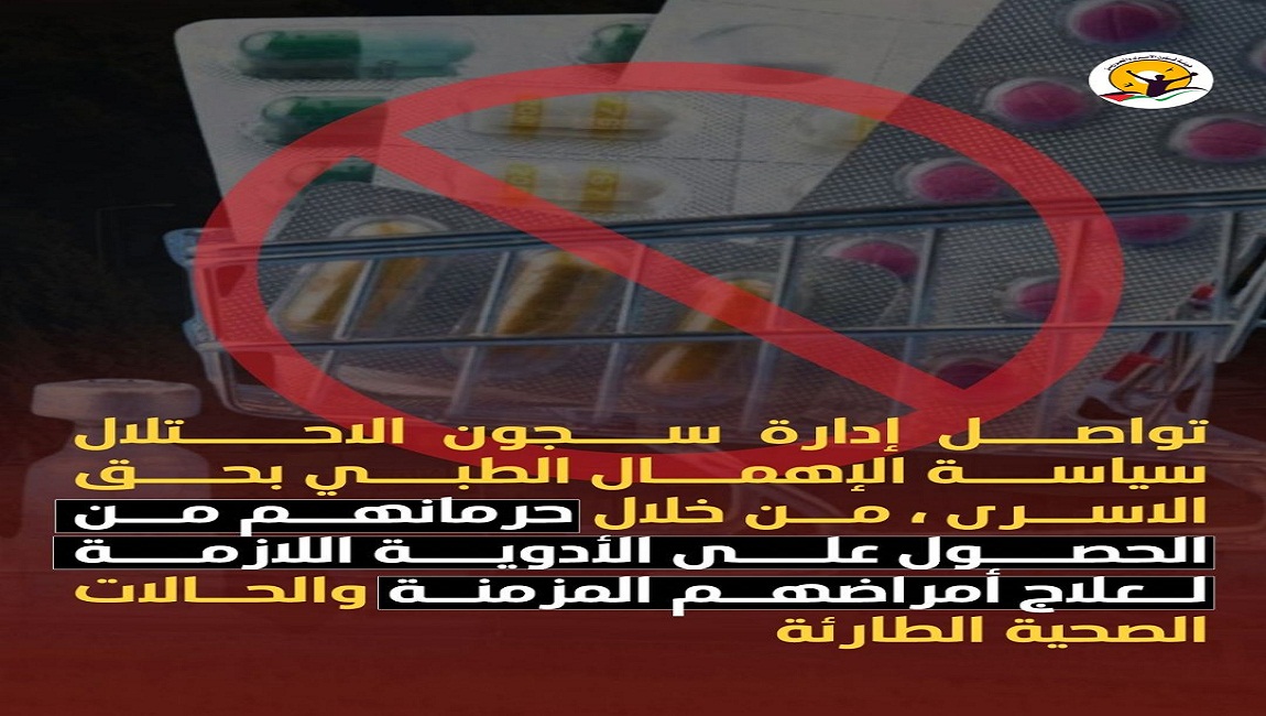 طباعة تواصل إدارة سجون الاحـتلال سياسة الإهمال الطبي بحق الاسرى، من خلال حرمانهم من الحصول على الأدوية اللازمة لعلاج أمراضهم المزمنة والحالات الصحية الطارئة. في 24 أيلول/سبتمبر 2025. نشر في الاخبار العاجلة