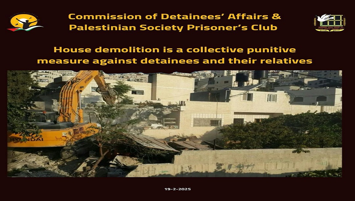 Print Commission of Detainees’ Affairs & Palestinian Society Prisoner’s Club House demolition is a collective punitive measure against detainees and their relatives on 19 February 2025. Posted in slider