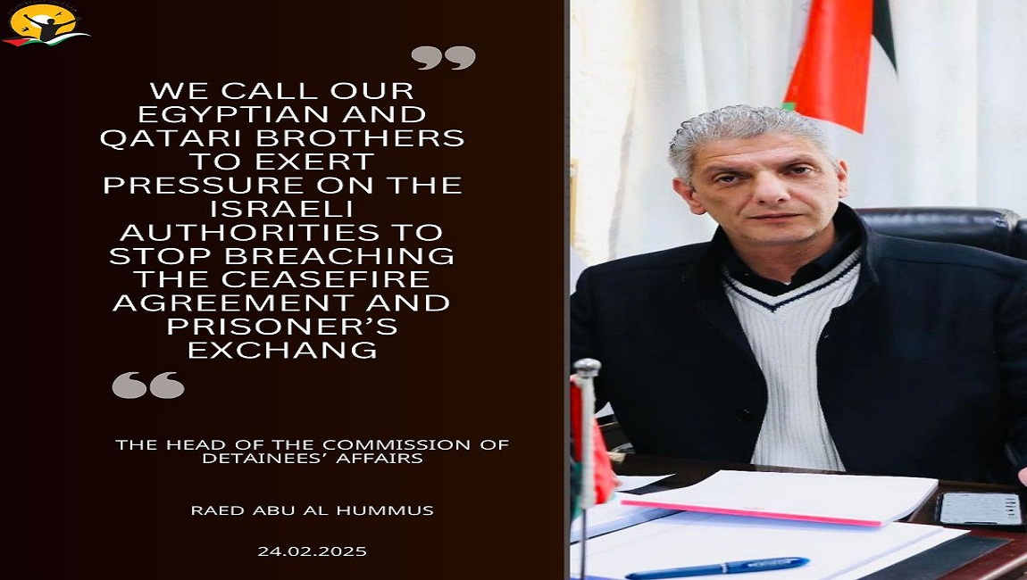 Print Abu Al Hummus: We call our Egyptian and Qatari brothers to exert pressure on the Israeli authorities to stop breaching the ceasefire agreement and prisoner’s exchange on 24 February 2025. Posted in slider