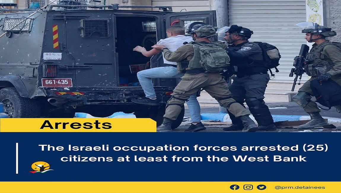 Print The Israeli occupation forces arrested (25) citizens at least from the West Bank on 21 December 2024. Posted in slider