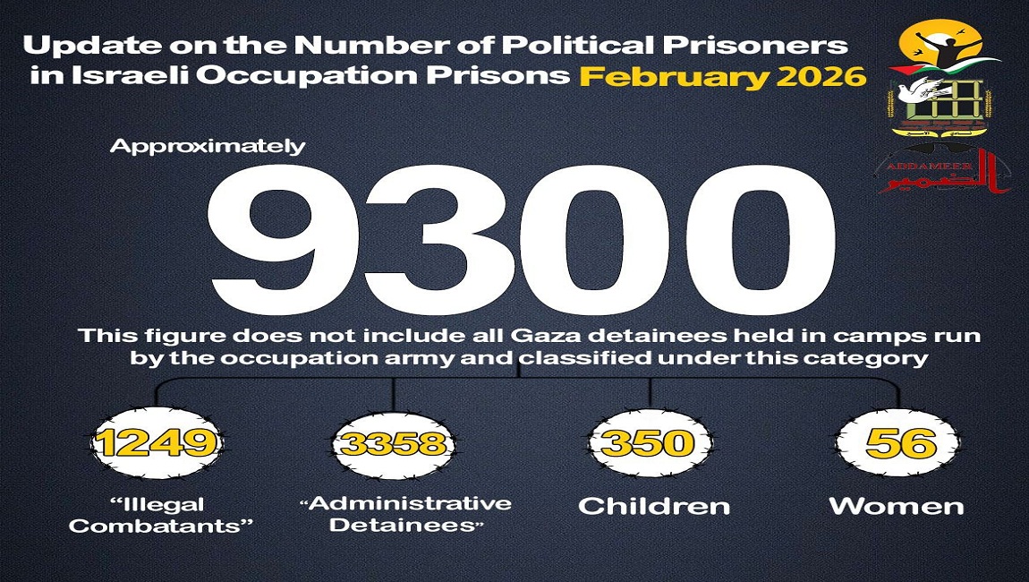 * The number of Palestinian political prisoners and detainees held in Israeli occupation prisons exceeded 9,300 people, as of the start of February 2026.