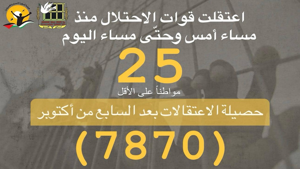 يشار إلى أنّ حصيلة الاعتقالات بعد السابع من أكتوبر، بلغت أكثر من (7845)، وهذه الحصيلة تشمل من جرى اعتقالهم من المنازل، وعبر الحواجز العسكرية، ومن اضطروا لتسليم أنفسهم تحت الضغط، ومن احتجزوا كرهائن.