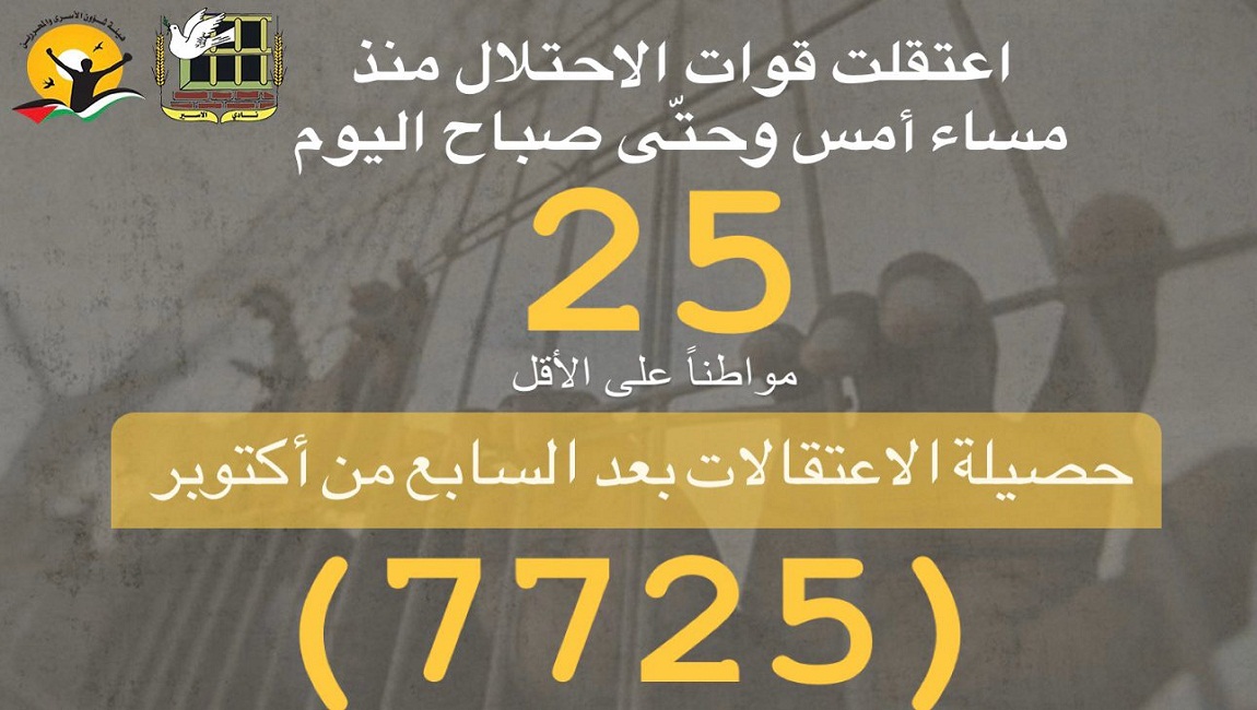 يشار إلى أنّ حصيلة الاعتقالات بعد السابع من أكتوبر، بلغت أكثر من (7725)، وهذه الحصيلة تشمل من جرى اعتقالهم من المنازل، وعبر الحواجز العسكرية، ومن اضطروا لتسليم أنفسهم تحت الضغط، ومن احتجزوا كرهائن.