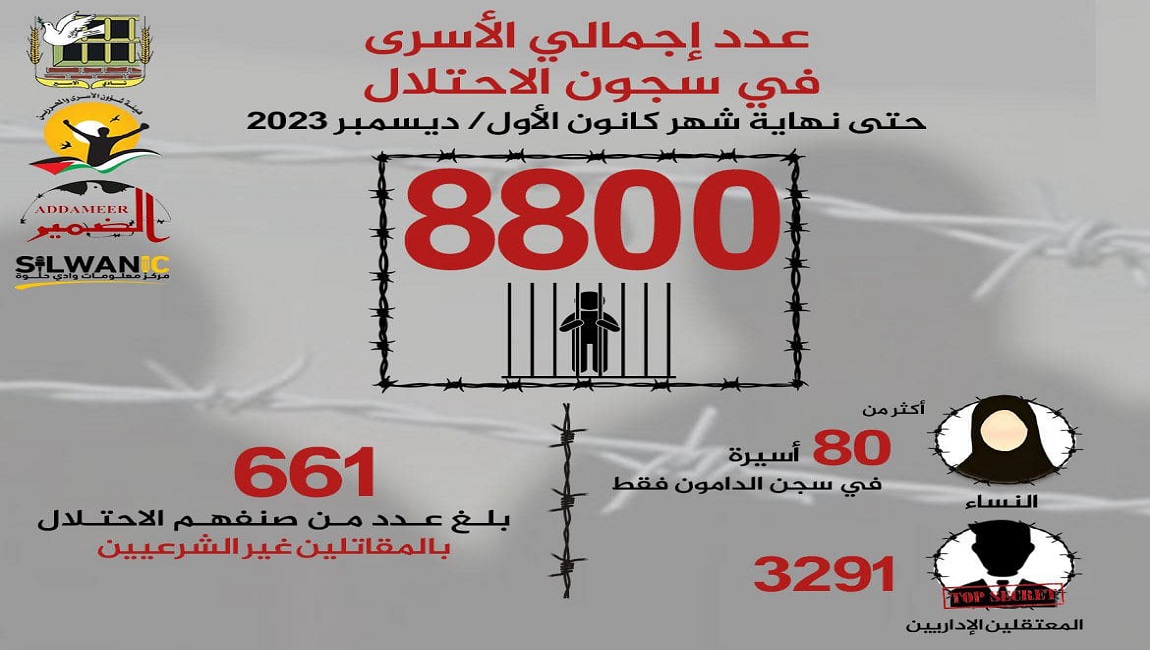 ويبلغ عدد إجمالي الأسرى في سجون الاحتلال حتى نهاية شهر كانون الأول/ ديسمبر 2023 (8800)، من بينهم أكثر من (80) أسيرة في سجن (الدامون) فقط فيما لم يتسن لنا التأكد من بقية النساء المعتقلات من غزة والمحتجزات في معسكرات أخرى، فيما لم تتوفر حصيلة دقيقة للأطفال في السجون، ويبلغ عدد الإداريين (3291)، وعدد من صنفهم الاحتلال بالمقاتلين غير الشرعيين (661)، وتعني هذه الحصيلة أنّ عدد إجمالي الأسرى زاد بـ 3550 أسير عن عدد الأسرى في السجون ما قبل السابع من أكتوبر، كما أن عدد الإداريين زاد بـ 1971 معتقل.