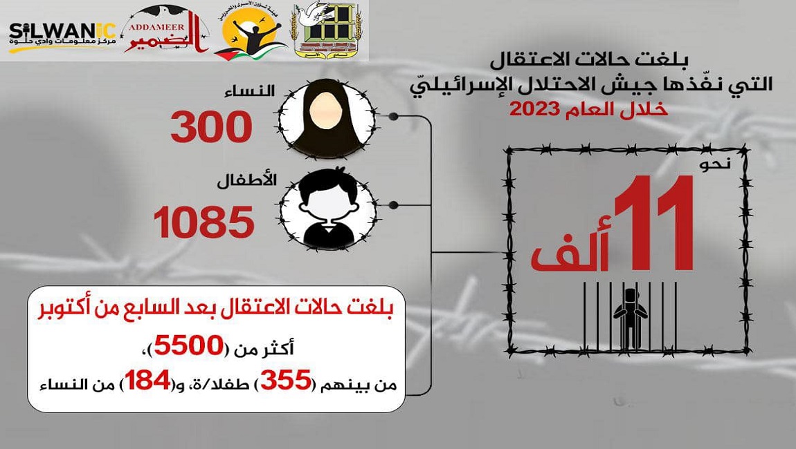 بلغت حالات الاعتقال التي نفّذها جيش الاحتلال الإسرائيليّ خلال العام 2023 في الضّفة بما فيها القدس إضافة إلى حالات الاعتقال من غزة ما قبل السابع من أكتوبر، نحو 11 ألف حالة اعتقال، إلا أنّ هذه الحصيلة لم تشمل معتقلي غزة بعد السابع من أكتوبر. وبلغت حالات الاعتقال بين صفوف النساء (300)، وتشمل هذه الحصيلة النساء اللواتي اُعتقلن من الأراضي المحتلة عام 1984 بعد السابع من أكتوبر، فيما بلغ عدد حالات الأطفال (1085).