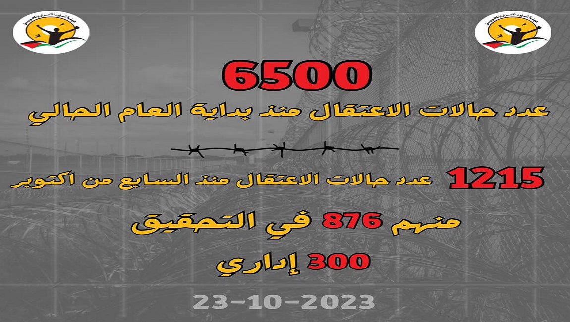 يذكر أنّ عدد حالات الاعتقال منذ السابع من أكتوبر الجاري، بلغ أكثر من (1265) حالة، وهذه الإحصائية لا تشمل العمال ولا معتقلين غزة، حيث لم تتمكن المؤسسات حتّى اليوم من الوصول إلى أعداد دقيقة وواضحة عن العمال المعتقلين، وكذلك المعتقلين من غزة.