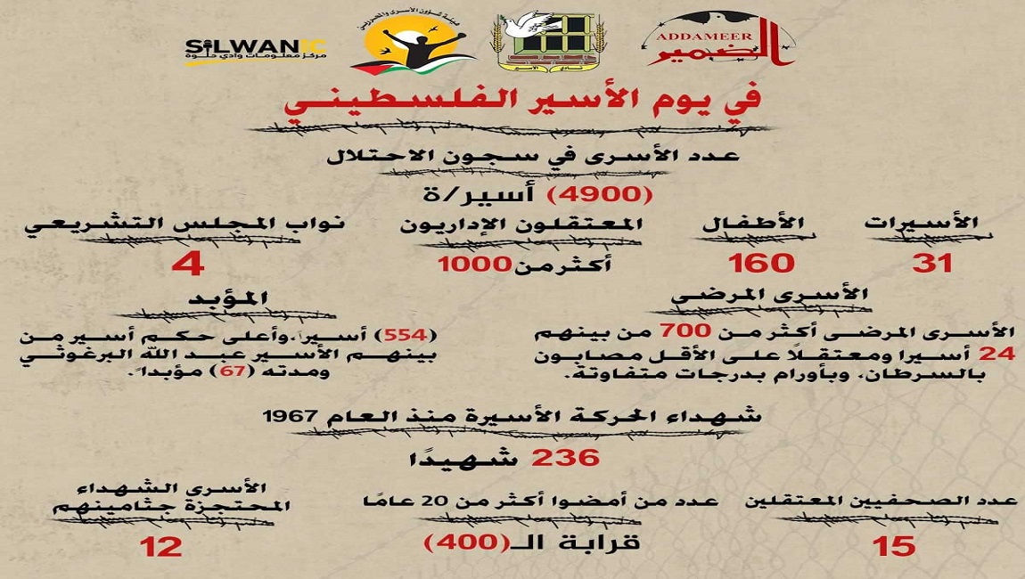 يصادف 17 نيسان يوم الأسير الفلسطيني الذي يأتي تزامنا مع تصعيد العدوان الإسرائيلي على الشعب الفلسطيني وتنفيذ المزيد من الانتهاكات والجرائم المنهجية.