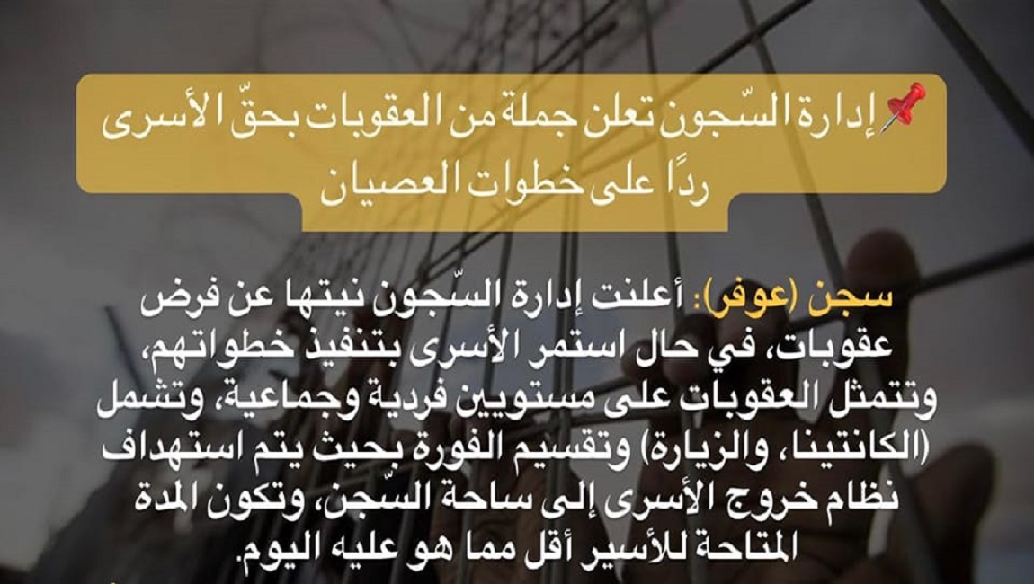 *سجن (عوفر)، أعلنت إدارة السّجون نيتها عن فرض عقوبات، في حال استمر الأسرى بتنفيذ خطواتهم، وتتمثل العقوبات على مستويين فردية وجماعية، وتشمل (الكانتينا، والزيارة) وتقسيم الفورة بحيث يتم استهداف نظام خروج الأسرى إلى ساحة السّجن، وتكون المدة المتاحة للأسير أقل مما هو عليه اليوم.*