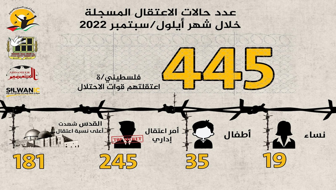 اعتقلت سلطات الاحتلال الإسرائيلي خلال شهر أيلول/ سبتمبر 2022، (445) فلسطينيًا/ة من الأرض الفلسطينية المحتلّة، من بينهم (35) طفلاً، و(19) من النساء.