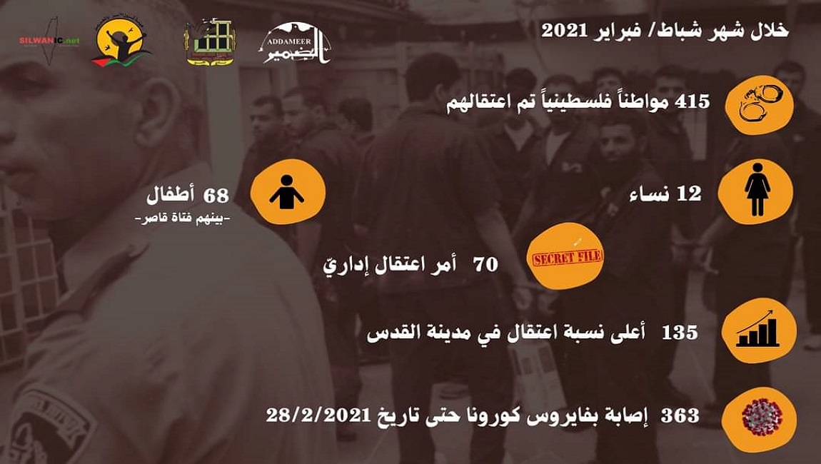 *ووفقًا لمتابعة المؤسسات الحقوقية الخاصّة بشؤون الأسرى، فإنّ قوات الاحتلال الإسرائيلي، اعتقلت، نحو (415) فلسطينياً/ة، خلال شهر شباط / فبراير 2021؛ من بينهم (68) طفلاً/ة، و(12) من النّساء، ووصل عدد أوامر الاعتقال الإداري الصادرة (70) أمر اعتقال إداري، بينها (21) أمرًا جديدًا، و(49) تجديد*