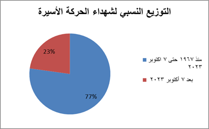 بلغ عدد شهداء الحركة الأسيرة حتى كتابة هذا التقرير 307 أسيراً شهيداً، منهم 70 شهيداً ما بعد حرب الإبادة (7 أكتوبر 2023)، بنسبة 23% من إجمالي شهداء الحركة الأسيرة.