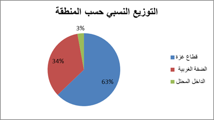 نلاحظ من الرسم البياني أعلاه أن النسبة الأعلى 63% هم من شهداء قطاع غزة والبالغ عددهم 44 شهيداً، ونسبة 34% من الضفة الغربية عددهم 24 شهيداً (أحدهم من القدس)، ونسبة 3% من الداخل المحتل وعددهم 2 شهيد.