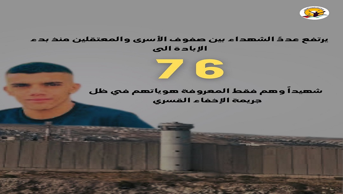 طباعة باستشهاد الأسير أحمد سعيد صالح طزازعة (20 عامًا) من مدينة جنين، فإن عدد الشهداء بين صفوف الأسرى والمعتقلين منذ بدء الإبادة يرتفع إلى 76 شهيداً وهم فقط المعروفة هوياتهم في ظل جريمة الإخفاء القسري . في 05 آب/أغسطس 2025. نشر في عارض الاخبار