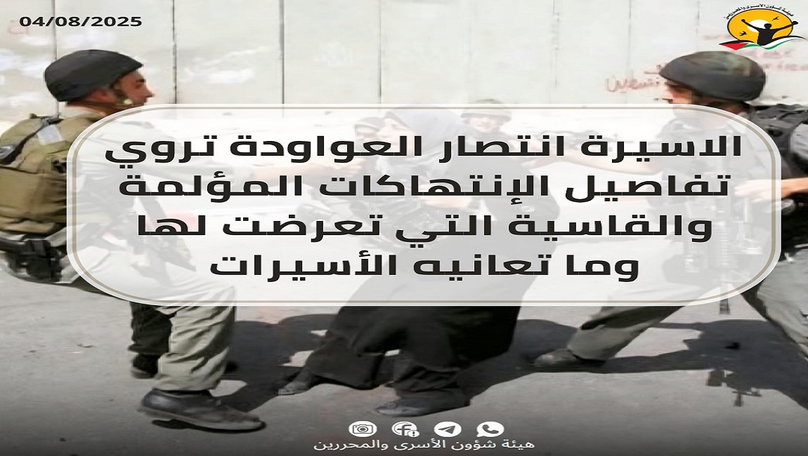 طباعة الاسيرة انتصار العواودة تروي تفاصيل الانتهاكات المؤلمة والقاسية التي تعرضت لها وما تعانيه الاسيرات في 04 آب/أغسطس 2025. نشر في عارض الاخبار